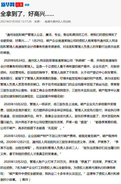 江蘇法制報截圖 近日“南通瑞東會計師事務(wù)所”的名字,不斷出現(xiàn)在《新華網(wǎng)》《江蘇法制報》的報道之中。一個小會所名字出現(xiàn)到主流新聞媒體中,實屬罕見。這要從我所承辦的一起破產(chǎn)案件說起。 2020年8月24日,通州區(qū)人民法院受理南通某瑞公司“執(zhí)轉(zhuǎn)破”一案,并指定南通瑞東會計師事務(wù)所擔(dān)任管理人。這是一個典型的企業(yè)無資產(chǎn)、無賬冊資料、無經(jīng)營場所的三無企業(yè),債權(quán)人看不到任何受償希望的破產(chǎn)案件。 南通瑞東會計師事務(wù)所由多名專業(yè)人員組成的清算組,主任會計師吳林海親自帶隊。在承辦法院的指導(dǎo)下,管理人從不動產(chǎn)登記中心到車管所,再到銀行,四處奔波,全方位開展資產(chǎn)調(diào)查工作,可惜仍未能發(fā)現(xiàn)有價值的財產(chǎn)信息。管理人團(tuán)隊苦苦尋思突破口,仔細(xì)尋找蛛絲馬跡,終于在稅務(wù)局申報表和市場監(jiān)督部門的企業(yè)檔案中發(fā)現(xiàn)了有益線索。原來債務(wù)人公司季某等三股東出資為認(rèn)繳制,全國工商企業(yè)信息查詢網(wǎng)顯示,三股東均未實際出資。根據(jù)企業(yè)進(jìn)入破產(chǎn)程序股東認(rèn)繳出資加速到期的法律規(guī)定,讓這起案件柳暗花明! 2020年10月22日,管理人一紙訴狀,將三股東告上法庭在申請訴訟保全后,債務(wù)人企業(yè)無力提供訴訟保全保證保險金的情況下管理人毅然決然決定有管理人機(jī)構(gòu)自己先行墊付,申請法院進(jìn)行了保全保全。終于,身兼企業(yè)法定代表人、股東的季某出面了,但未發(fā)現(xiàn)他有履行能力。另外兩名不參與公司經(jīng)營的股東湯某、尹某一臉“委屈”:“都是季某惹的禍,公司不破產(chǎn),再多的錢砸下去都是‘無底洞’。但是法律是公正的,2020年12月21日,通州區(qū)人民法院判決三股東必須承擔(dān)出資義務(wù)。管理人負(fù)責(zé)人告知被告“股東出資是你們應(yīng)當(dāng)履行的義務(wù),拿不到錢的債權(quán)人才是真正的受害者!逼扔诜傻耐,2020年12月22日,“想通了”的湯某、尹某向管理人賬戶打來了20萬元,最終, 7名打工人員全額拿回血汗錢! “破產(chǎn)管理人專業(yè)、敬業(yè)和高效的工作,使我們的債權(quán)得到了全額受償,好高興……”1月29日,破產(chǎn)企業(yè)南通某瑞公司的債權(quán)人楊某等向管理人南通瑞東會計師事務(wù)所寄來感謝信,對管理人的辛勤付出表示由衷的感謝。 為債權(quán)人楊某代理執(zhí)行的律師感嘆:“破產(chǎn)案件中債權(quán)全額受償,我執(zhí)業(yè)二十多年來從沒見過。” 盡職、盡力、盡心、盡我所能,維護(hù)債權(quán)人的利益、維護(hù)法律的權(quán)威這是南通瑞東會計師事務(wù)所作為破產(chǎn)管理人一貫堅持的基本原則。所承辦案件得到債權(quán)人的認(rèn)可,得到法院的肯定,這是管理人的最大榮譽。 |